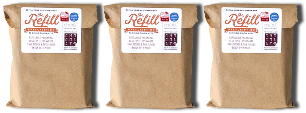 Savor the chocolate and keep the empty recycled cardboard box, you will need it for the refills. The refills are the same amount of deliciousness, but in a recycled brown paper bag. Same number of bites, same pleasure, but for less.